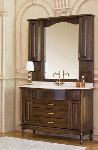 Комплект мебели для ванной комнаты Аллигатор «Capan С(D)» изготавливается из сто процентного массива дуба, в зависимости от цвета меняется покрытия мебели. Покрытие может быть трехслойным, влагостойким бесцветным лаком и влагостойким тонированным лаком. Мебель Аллигатор «Capan С(D)» может быть выполнена в одном из двенадцати вариантов отделки, благодаря чему вы можете подобрать наиболее подходящий вашему интерьеру цвет мебели. Столешница изготовлена из натурального мрамора и укомплектована врезной фаянсовой раковиной Испанской фирмы Roca. Доводчики в ящиках обеспечивают бесшумное и плавное закрытие двери. Окантовка зеркала так же изготавливается из массива дуба и красится в тон мебели. Зеркало Аллигатор «Capan С(D)» комплектуется двумя светильниками, плафоны светильников идут в матовом стекле. Комплект мебели для ванной комнаты Аллигатор «Capan С(D)» выполнен в классическом стиле. Резные детали придают этой мебели изящность и подчеркивают ее классический стиль.