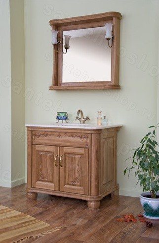 Комплект мебели для ванной комнаты Аллигатор «Classic ALC 90А» изготавливается из сто процентного массива дуба, в зависимости от цвета меняется покрытия мебели. Покрытие может быть трехслойным, влагостойким бесцветным лаком и влагостойким тонированным лаком. Мебель Аллигатор «Classic ALC 90А» может быть выполнена в одном из двенадцати вариантов отделки, благодаря чему вы можете подобрать наиболее подходящий вашему интерьеру цвет мебели. Столешница изготовлена из натурального мрамора и укомплектована врезной фаянсовой раковиной Испанской фирмы Roca. Распашные двери на тумбе идут на петлях со встроенным доводчиком. Доводчики в петлях обеспечивают бесшумное и плавное закрытие двери. Окантовка зеркала так же изготавливается из массива дуба и красится в тон мебели. Зеркало Аллигатор «Classic ALC 90А» комплектуется двумя светильниками, металлическая часть которых выполнена в тон фурнитуры на мебели. Плафоны светильников идут в матовом стекле. Комплект мебели для ванной комнаты Аллигатор «Classic ALC 90А» выполнен в классическом стиле. Резные детали придают этой мебели изящность и подчеркивают ее классический стиль.