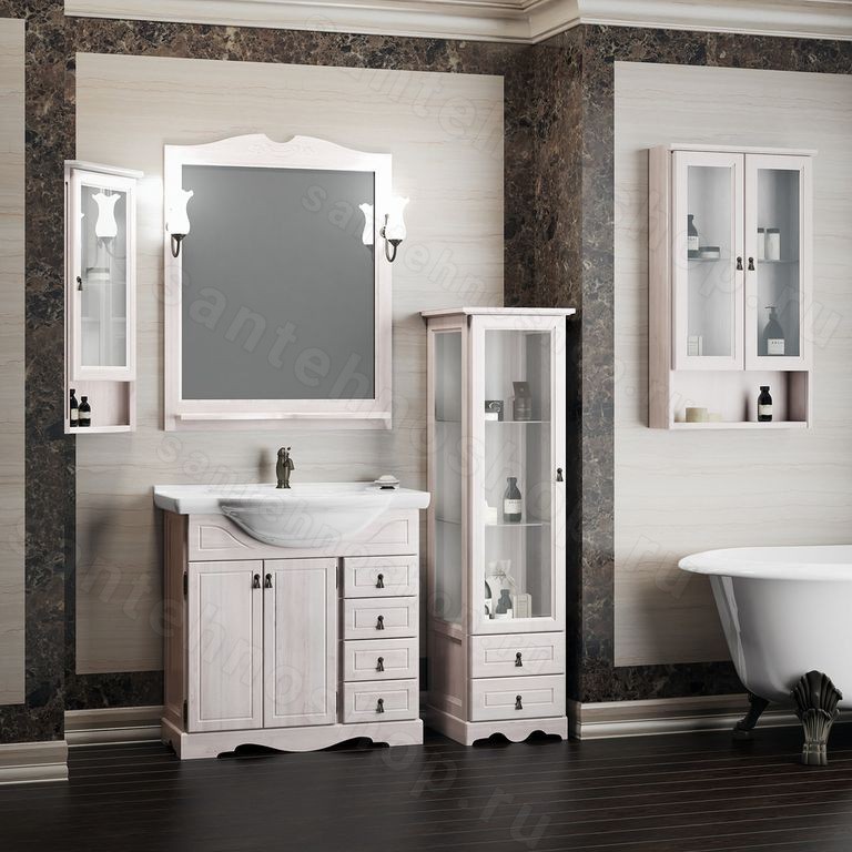 Тумба в комплект мебели Opadiris «Клио 85» имеет асимметричное расположение и будто разделена на две части. С одной стороны это две распашных дверцы, а с другой четыре небольших выдвижных ящика. Объединяет и создает общий силуэт тумбы небольшой цельный элемент с фразировкой и раковина с центральным расположением рабочей части. На зеркале расположена небольшая полка с плавным изгибом в середине для того чтобы исключить возможность задеть ее например при умывании. Так же на зеркало устанавливаются два светильника для дополнительного освещения полотна и ванны.