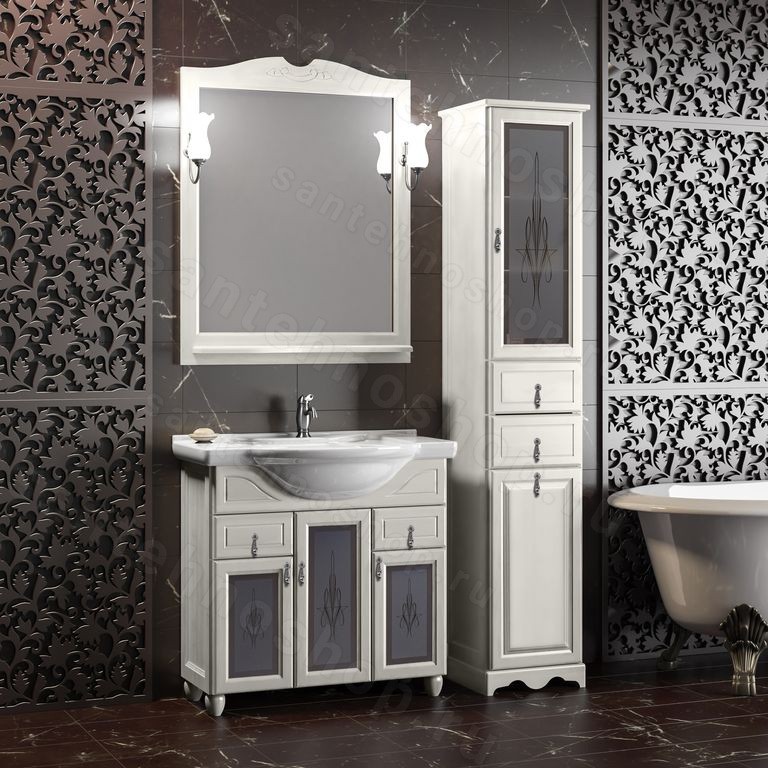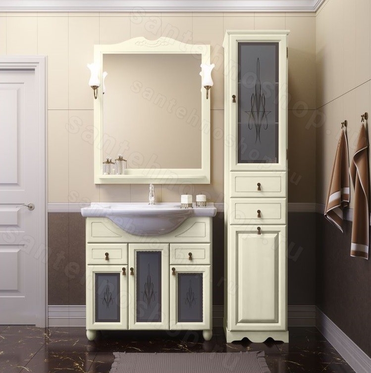 Фасады комплекта мебели Opadiris «Тибет 85» изготовленные из массива бука и украшены резными элементами. В дверцы мебели интегрированы практически полностью матовые стеклянные элементы, на которые нанесен орнамент. В самой тумбе есть как распашные, так и выдвижные отделения, что позволит разместить по ним абсолютно разные предметы. На зеркало с полкой возможна установка двух светильников, которые можно использовать как приглушенный свет в ванной комнате. Раковина для мебели Opadiris «Тибет 85» изготовлена из санфаянс, который предназначен именно для ванных комнат и обладает антибактериальными свойствами.