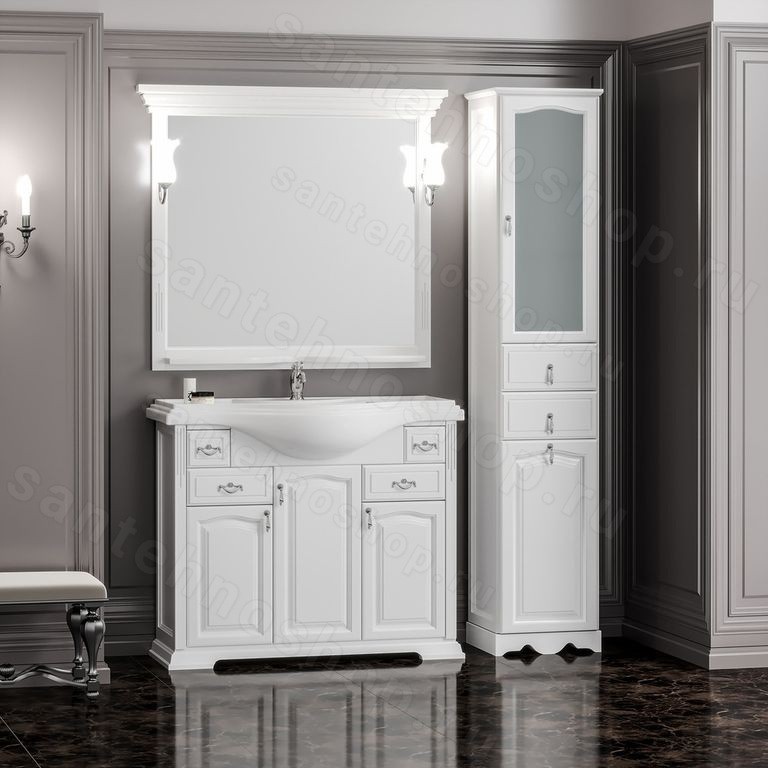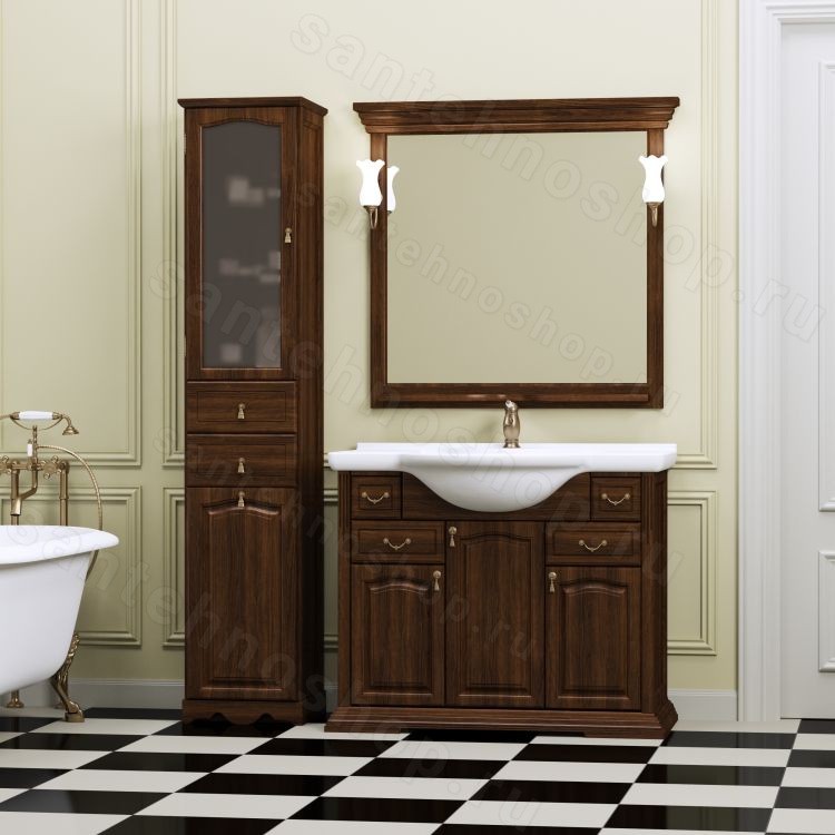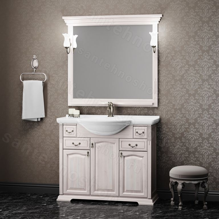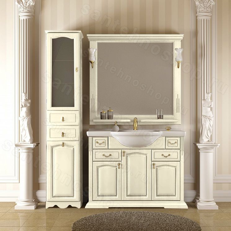 В дизайне комплект мебели Opadiris «Риспекто 105» четко прослеживается стиль, в котором выполнены здания венецианской эпохи. Конечно же, в цвете античного ореха или просто белом сложно это уловить, но вот касательно цвета слоновая кость сразу все становится на свои места. Несмотря на то, что в мебели довольно много разных ящиков, это не смотрится аляписто. Как раз напротив расположения ящиков будто говорит об их иерархическом положении, начиная с маленького и заканчивая самым большим. Основания мебели Opadiris «Риспекто 105» будто стоит на постаменте, который выполняет как декоративную так опорную функцию.