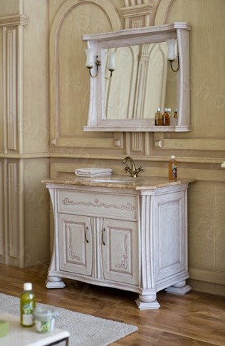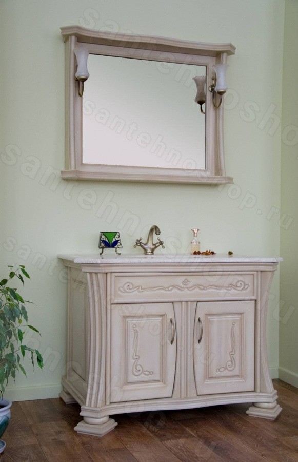 Мебель для ванной комнаты Аллигатор «Classic ALC 100В» изготавливается из сто процентного массива дуба, в зависимости от цвета меняется покрытия мебели. Покрытие может быть трехслойным, влагостойким бесцветным лаком и влагостойким тонированным лаком. Мебель Аллигатор «Classic ALC 100В» может быть выполнена в одном из двенадцати вариантов отделки, благодаря чему вы можете подобрать наиболее подходящий вашему интерьеру цвет мебели. Столешница изготовлена из натурального мрамора и укомплектована врезной фаянсовой раковиной Испанской фирмы Roca. Распашные двери на тумбе идут на петлях со встроенным доводчиком. Доводчики в петлях обеспечивают бесшумное и плавное закрытие двери. Окантовка зеркала так же изготавливается из массива дуба и красится в тон мебели. Зеркало Аллигатор «Classic ALC 100В» комплектуется двумя светильниками, металлическая часть которых выполнена в тон фурнитуры на мебели. Плафоны светильников идут в матовом стекле. Комплект мебели для ванной комнаты Аллигатор «Classic ALC 100В» выполнен в классическом стиле. Резные детали придают этой мебели изящность и подчеркивают ее классический стиль.
