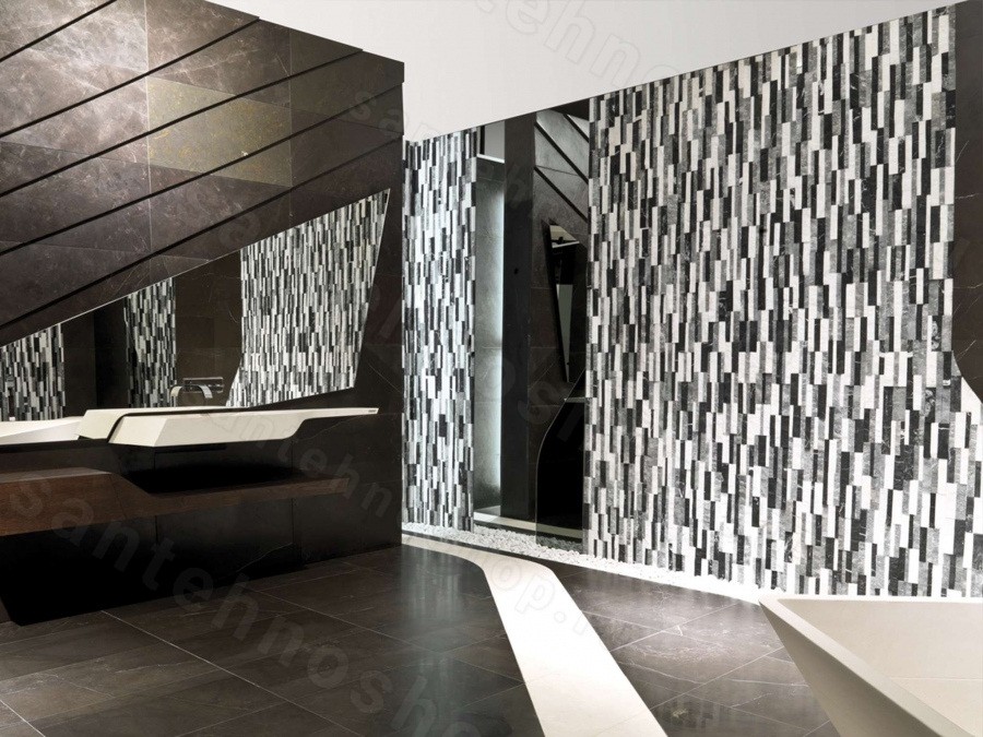 Мозаика из натурального камня и стекла с добавлением специальной смолы, которая украшена цветочными мотивами и имеет различную ширину, но одинаковую толщину.