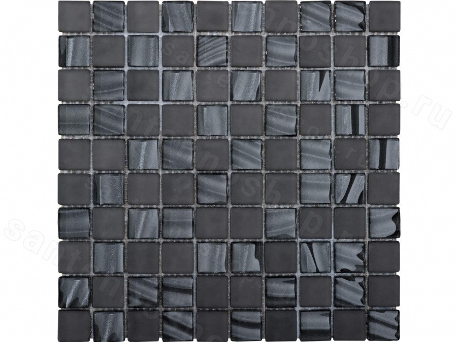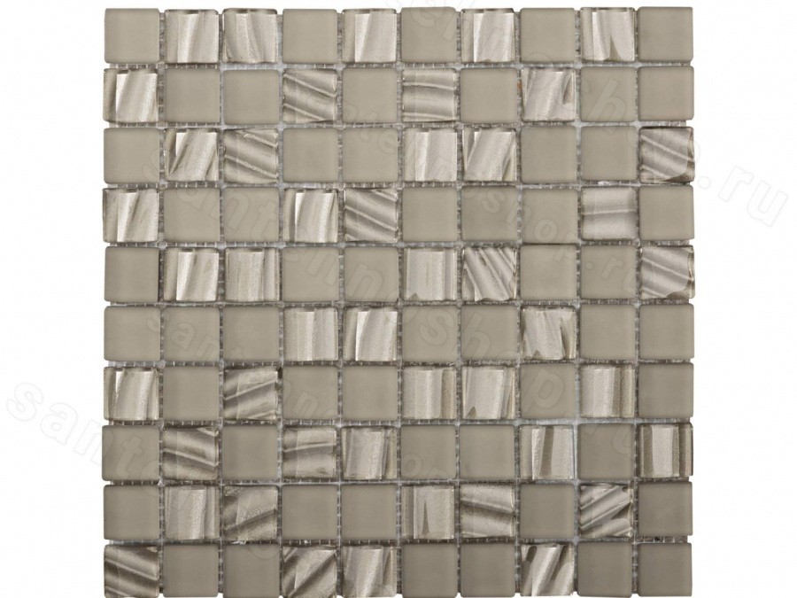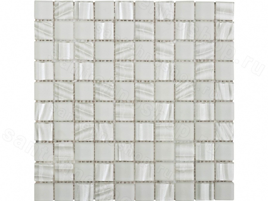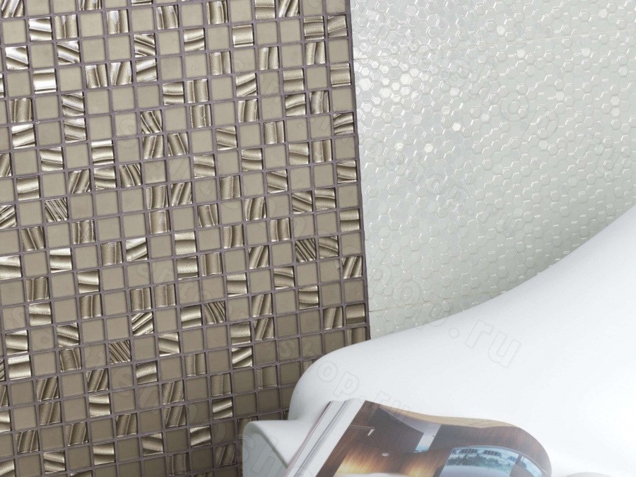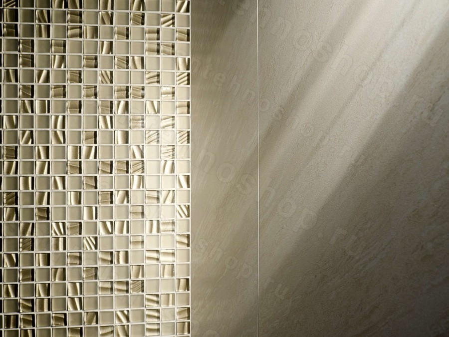 Мозаика из полупрозрачного стекла с нанесением цвета на заднюю часть элементов, что подчеркивает их глубину, и с волнообразной поверхностью. Сочетается отделка brillo и mate.