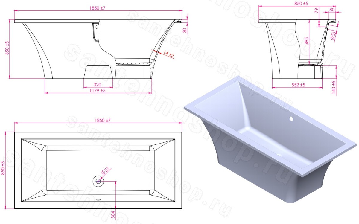 Комплектация включает регулируемые ножки, которые позволяют точно установить ванну даже на неидеально ровном основании. Встроенный перелив защищает от переполнения, а гладкая внутренняя поверхность упрощает уход. Модель не оснащена антискользящим и антибактериальным покрытием, но за счёт однородной структуры материала и отсутствия микропор она обладает хорошими гигиеническими характеристиками и не способствует накоплению загрязнений.